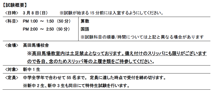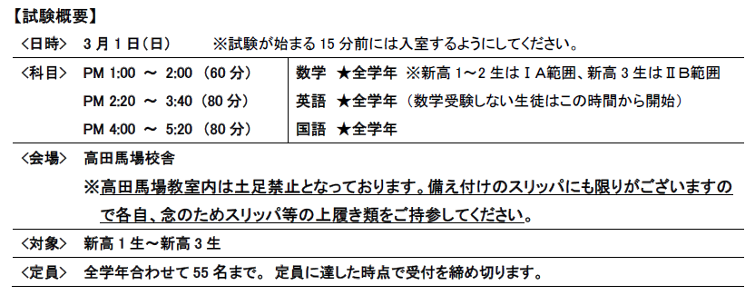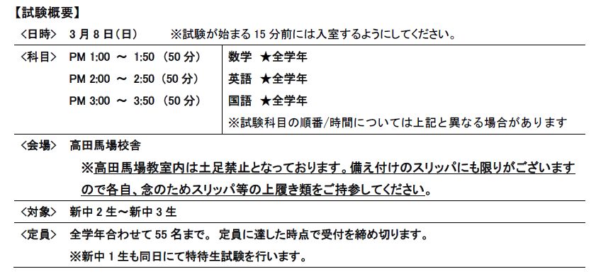 ▼「特待生選抜試験」日程 開催校舎:高田馬場校