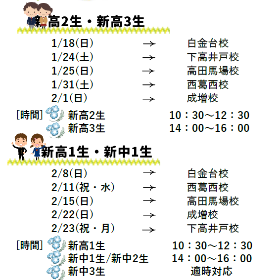 成増塾では新規開講(2月受講開始:2/2~)に向けて、各校舎で新規入塾説明会を行います。
