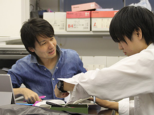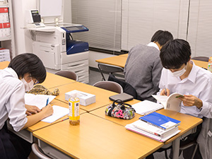 受験学年の生徒の質問に終電近くまで対応する甲斐講師。疑問が解消されるまで徹底的に付き合います。